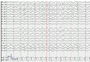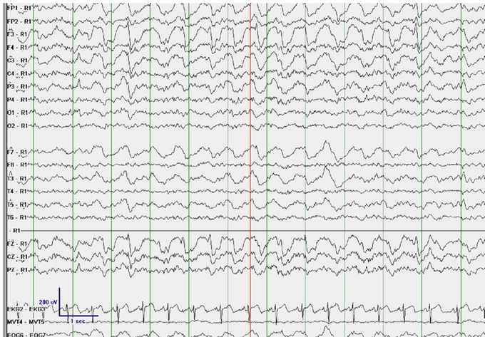 Panel shows electrographic seizure activity over the left frontal region (maximal amplitude at F3) on a referential montage with R1 placed over the 2nd cervical vertebra.